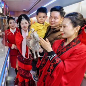 2月11日,西安北开往香港西九龙的G916次陕港高铁列车上,身着汉服的工作人员向旅客展示汉代马形文物复制品,并讲解相关历史文化。(国铁西安局集团公司供图)