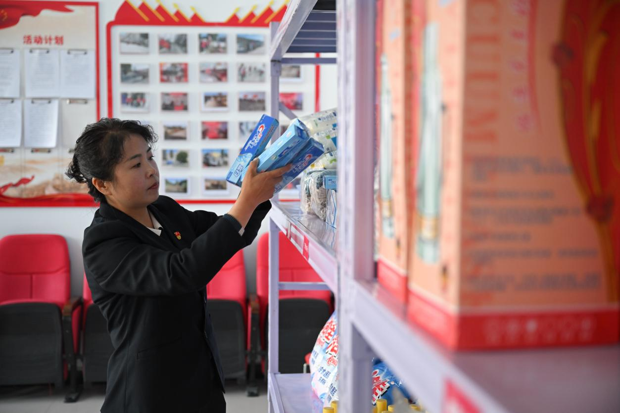 4月13日,才堂村党支部书记胡海英正在整理“积分超市”的奖品。新华社记者 张龙 摄
