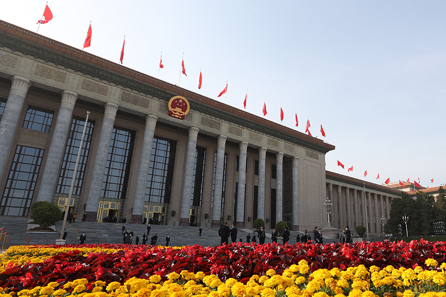 中国共产党第二十次全国代表大会新闻发言人于2022年10月15日(星期六)16时30分在人民大会堂举行新闻发布会。图为人民大会堂外景。(新华网 王翰林 摄)