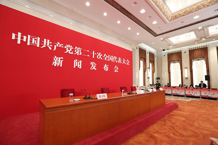 中国共产党第二十次全国代表大会新闻发言人于2022年10月15日(星期六)16时30分在人民大会堂举行新闻发布会。图为发布会开始前。(新华网 王翰林 摄)
