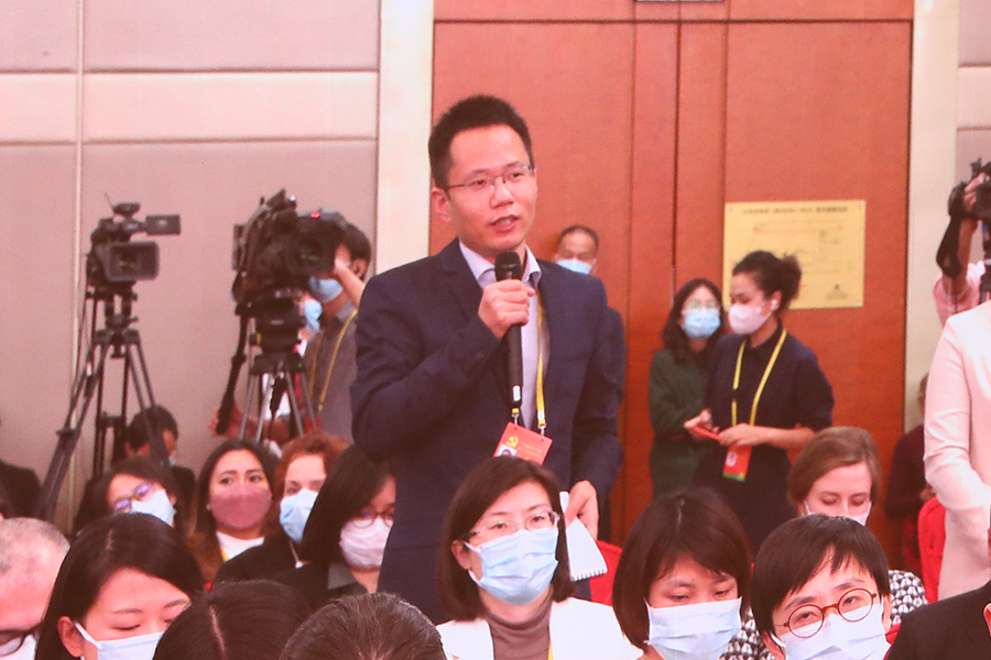 中国共产党第二十次全国代表大会新闻发言人2022年10月15日(星期六)16时30分在人民大会堂举行新闻发布会。图为