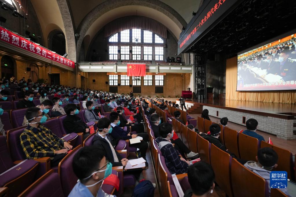 10月16日,在清华大学大礼堂,清华大学师生在收看中国共产党第二十次全国代表大会开幕会。
