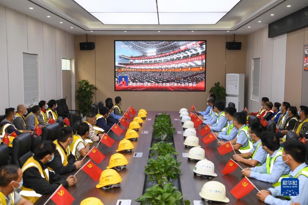 10月16日,中建科工重庆联合产业孵化基地项目建筑工人在收看中国共产党第二十次全国代表大会开幕会。