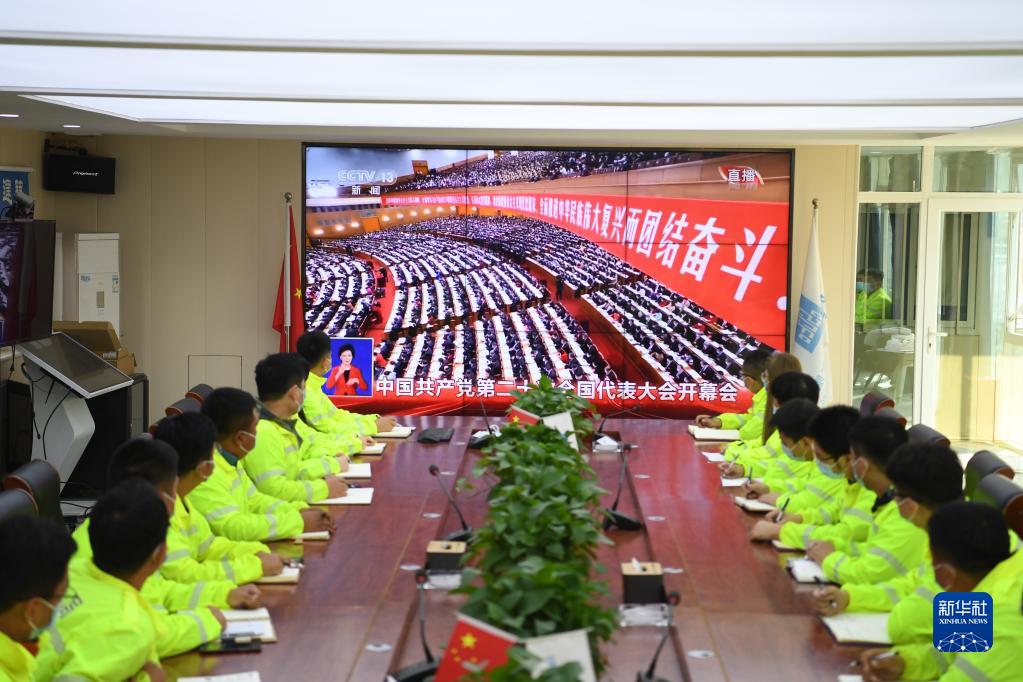 10月16日,在河北雄安新区中建二局容东项目部,工作人员在收看中国共产党第二十次全国代表大会开幕会。