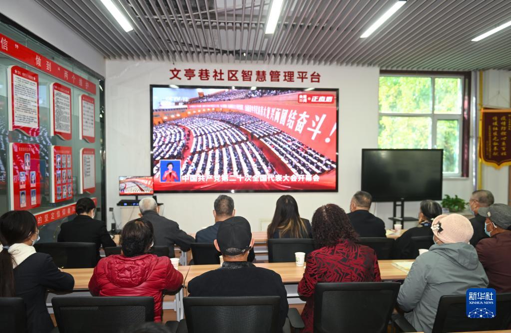 10月16日,在青海省西宁市城西区文亭巷社区党群服务中心,居民在收看中国共产党第二十次全国代表大会开幕会。