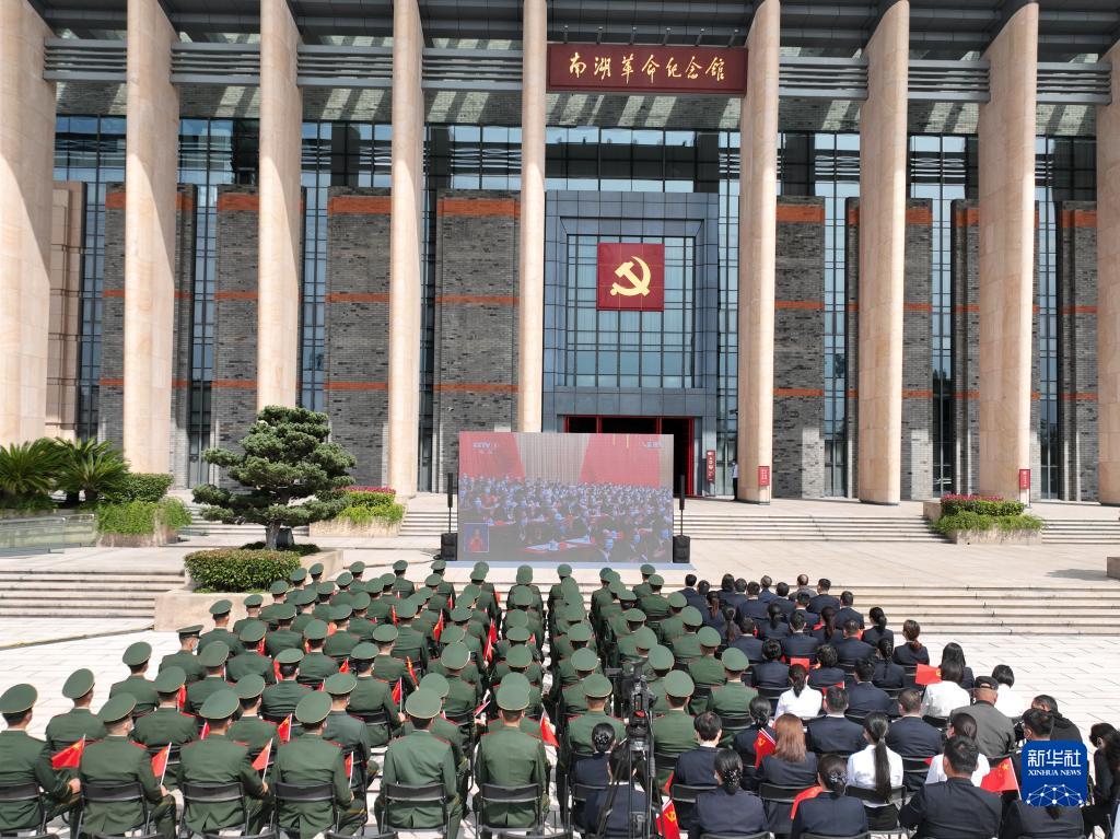 10月16日,武警浙江总队嘉兴支队官兵在南湖革命纪念馆前与工作人员一起收看中国共产党第二十次全国代表大会开幕会(无人机照片)。