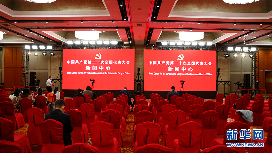 10月17日(星期一)10:00,二十大新闻中心将在梅地亚新闻中心二层新闻发布厅举办第一场记者招待会。图为记者招待会前