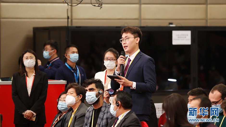 10月17日(星期一)10:00,二十大新闻中心在梅地亚新闻中心二层新闻发布厅举办第一场记者招待会。这是记者在分会场提问。(新华网 陈杰 摄)