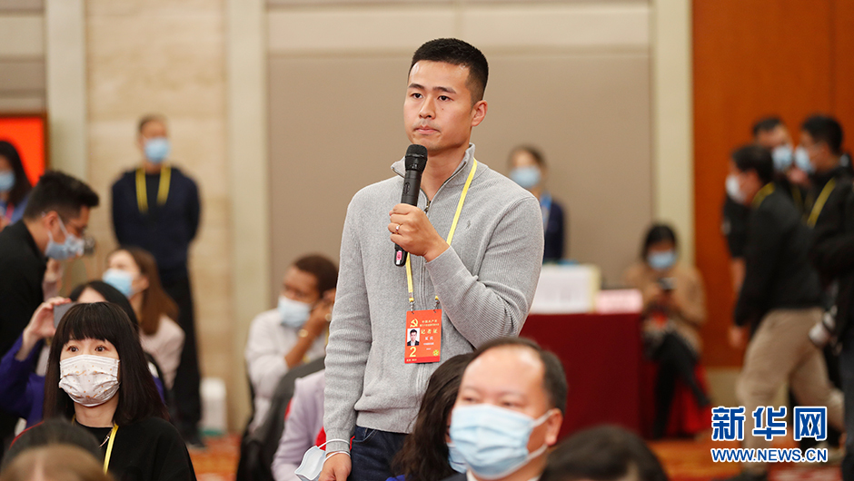 10月17日(星期一)10:00,二十大新闻中心在梅地亚新闻中心二层新闻发布厅举办第一场记者招待会。这是记者在分会场提问。(新华网 陈杰 摄)