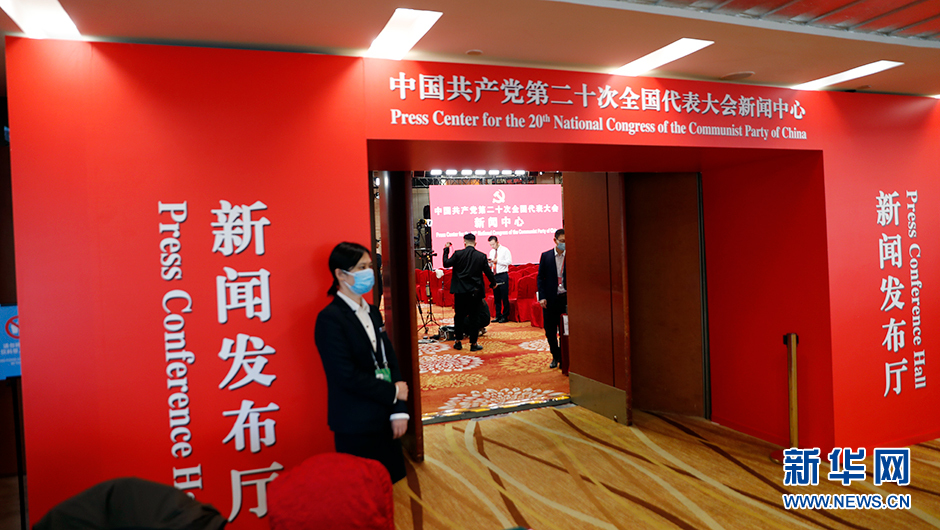 10月17日(星期一)15:00,二十大新闻中心将在梅地亚新闻中心二层新闻发布厅举办第二场记者招待会。图为记者招待会前新世纪日航饭店三层世纪厅分会场。(新华网 陈杰 摄)