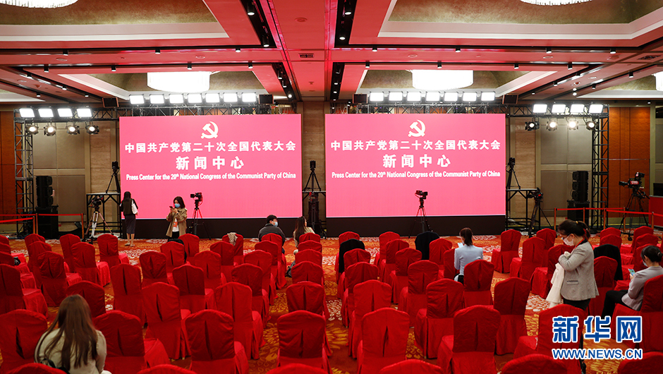 10月17日(星期一)15:00,二十大新闻中心将在梅地亚新闻中心二层新闻发布厅举办第二场记者招待会。图为记者招待会前新世纪日航饭店三层世纪厅分会场。(新华网 陈杰 摄)