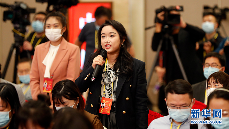 10月18日(星期二)19:30,二十大新闻中心在梅地亚新闻中心二层新闻发布厅举办第二场集体采访。图为中国日报记者在分会场提问。(新华网 陈杰 摄)