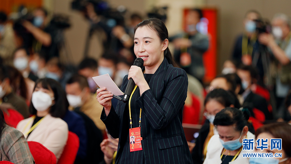 10月18日(星期二)19:30,二十大新闻中心在梅地亚新闻中心二层新闻发布厅举办第二场集体采访。图为中国自然资源报记者在分会场提问。(新华网 陈杰 摄)