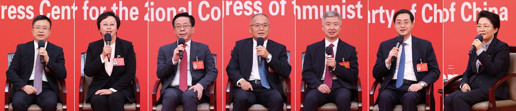 10月19日,中国共产党第二十次全国代表大会新闻中心举行集体采访。重庆、四川、贵州、云南、西藏、陕西、甘肃代表团新闻发言人出席,介绍代表团学习讨论二十大报告情况,并回答记者提问(拼版照片)。