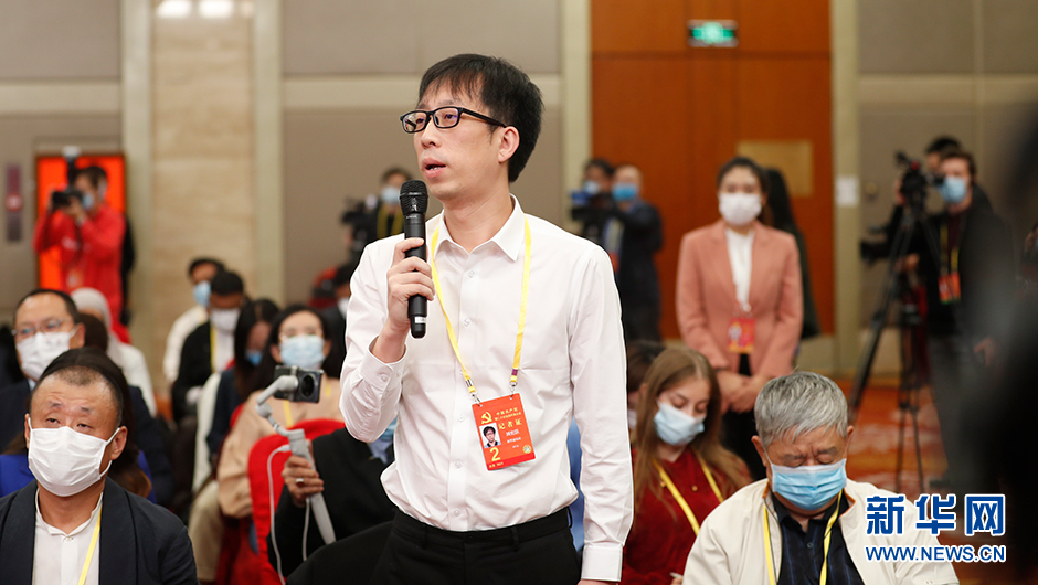 10月19日(星期三)10:00,二十大新闻中心在梅地亚新闻中心二层新闻发布厅举办第三场记者招待会。图为新华社记者在分会场提问。(新华网 陈杰 摄)