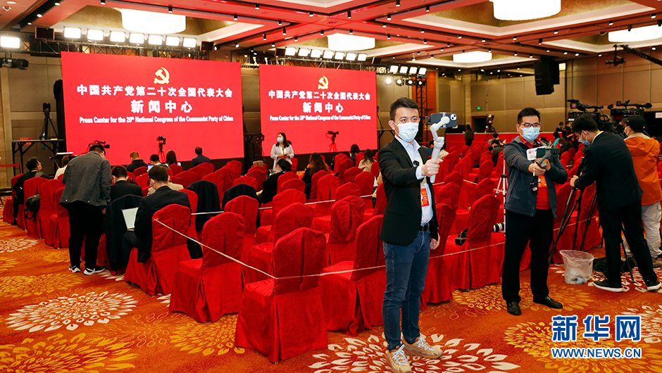 10月19日(星期三)15:00,二十大新闻中心将在梅地亚新闻中心二层新闻发布厅举办第三场集体采访。图为集体采访前新世纪日航饭店三层世纪厅分会场现场。(新华网 陈杰 摄)
