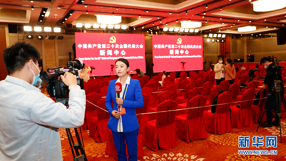 10月19日(星期三)19:30,二十大新闻中心将在梅地亚新闻中心二层新闻发布厅举办第四场集体采访。图为集体采访前新世纪日航饭店三层世纪厅分会场。(新华网 陈杰 摄)