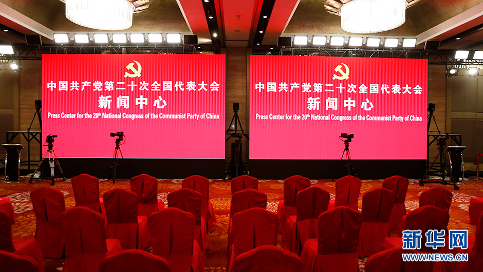 10月19日(星期三)19:30,二十大新闻中心将在梅地亚新闻中心二层新闻发布厅举办第四场集体采访。图为集体采访前新世纪日航饭店三层世纪厅分会场。(新华网 陈杰 摄)