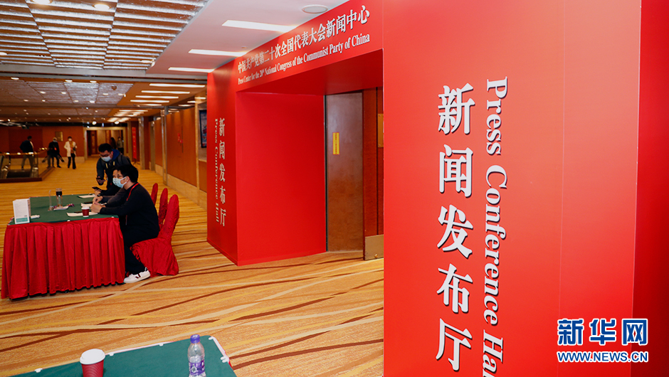 10月19日(星期三)19:30,二十大新闻中心将在梅地亚新闻中心二层新闻发布厅举办第四场集体采访。图为集体采访前新世纪日航饭店三层世纪厅分会场。(新华网 陈杰 摄)