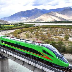 2021年6月25日,全长435公里、设计时速160公里的拉林铁路建成通车,西藏首条电气化铁路建成,同时复兴号实现对31个省区市全覆盖。这是试运行的复兴号列车行驶在西藏山南市境内(2021年6月16日摄)。新华社记者 觉果 摄