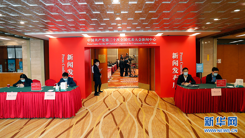 10月20日(星期四)10:00,二十大新闻中心将在梅地亚新闻中心二层新闻发布厅举办第四场记者招待会。图为记者招待会前新世纪日航饭店三层世纪厅分会场。(新华网 陈杰 摄)