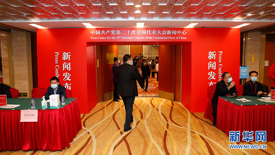 10月20日(星期四)19:30,二十大新闻中心将在梅地亚新闻中心二层新闻发布厅举办第五场集体采访。图为集体采访前新世纪日航饭店三层世纪厅分会场。(新华网 陈杰 摄)