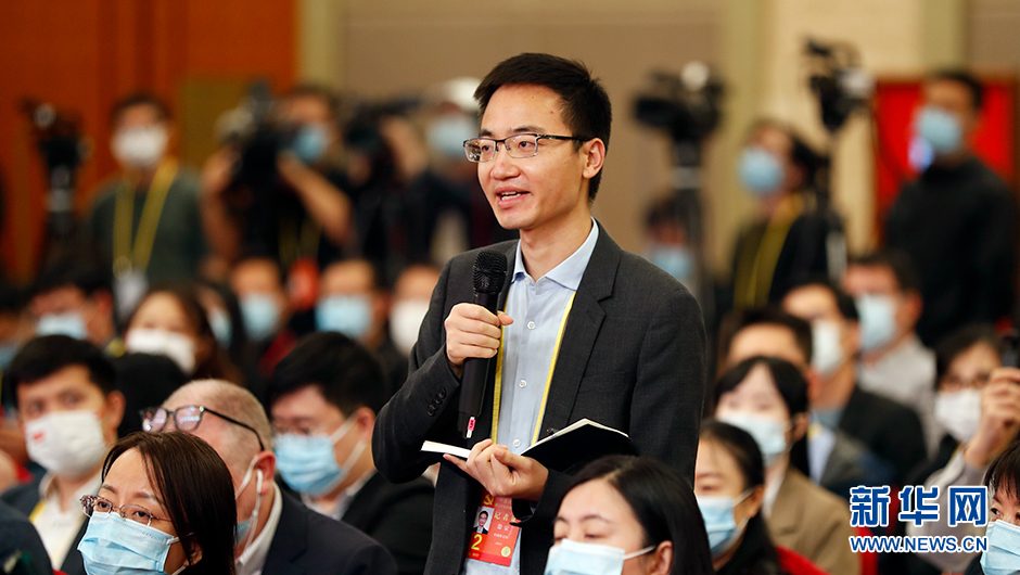 10月20日(星期四)19:30,二十大新闻中心在梅地亚新闻中心二层新闻发布厅举办第五场集体采访。图为中国外文局中国报道杂志记者提问。(新华网 陈杰 摄)