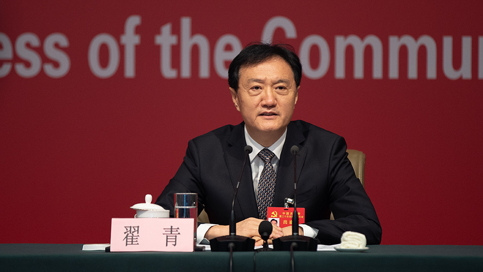 10月21日,二十大新闻中心举办第五场记者招待会,请生态环境部党组成员、副部长翟青围绕“建设人与自然和谐共生的美丽中国”主题与记者交流。图为翟青在记者招待会上。(新华网 刘厦 摄)