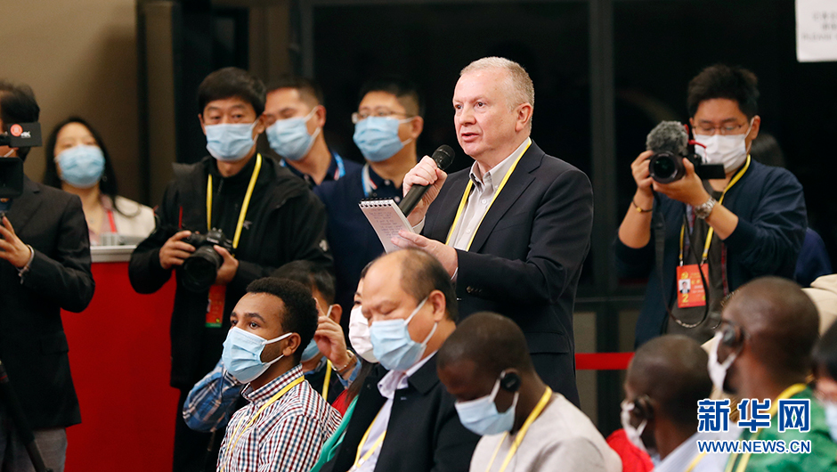 10月21日(星期五)10:00,二十大新闻中心举办第五场记者招待会。图为彭博新闻社记者在分会场提问。(新华网 陈杰 摄)