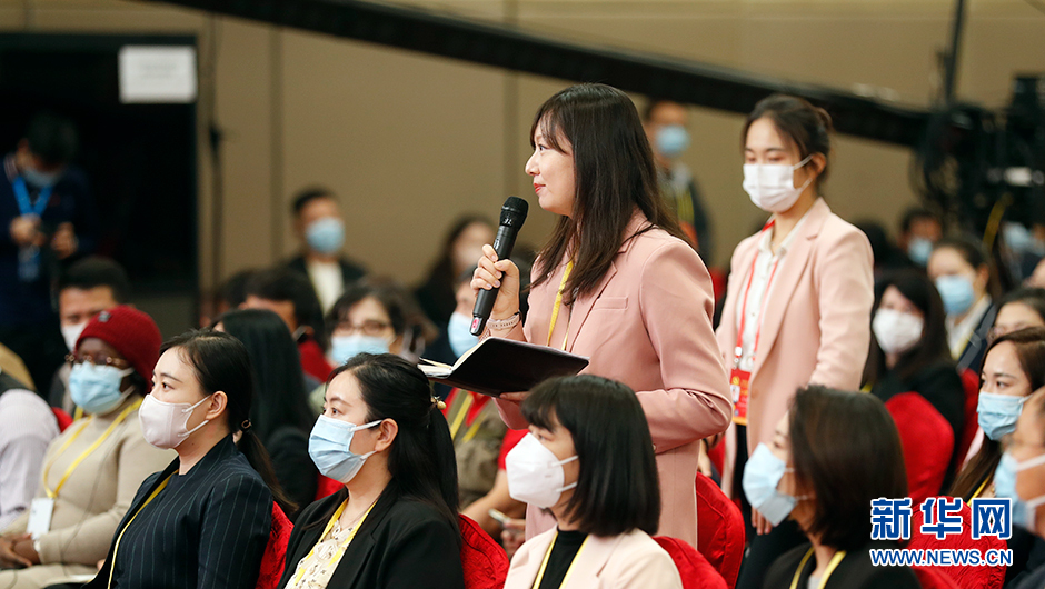 10月21日(星期五)10:00,二十大新闻中心举办第五场记者招待会。图为中央广播电视总台记者在分会场提问。(新华网 陈杰 摄)