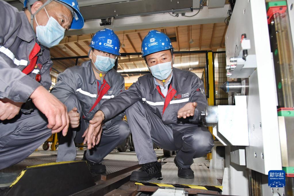 11月2日,在中车青岛四方机车车辆股份有限公司转向架分厂车间,郭锐(右一)与同事对自动检测主动找正装置进行验证。
