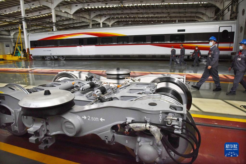11月2日,郭锐(右二)来到中车青岛四方机车车辆股份有限公司总装车间,准备向工友们宣讲党的二十大精神。