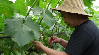 烟雨朦胧的秦岭脚下,在西安市鄠邑区化西村,一片30余亩的葡萄园里葡萄架上挂满青绿色的果实。在蜿蜒曲折的藤蔓、郁郁葱葱的枝叶间,隐约可见一个小伙儿正在给葡萄果修修剪剪。