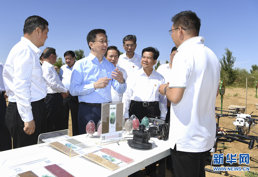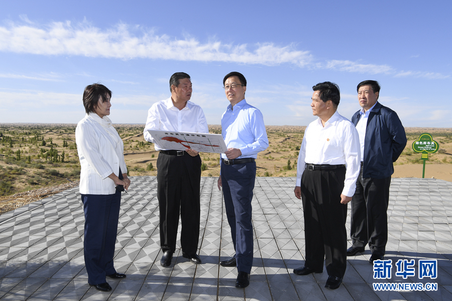 8月26日至27日,中共中央政治局常委、国务院副总理韩正到内蒙古自治区鄂尔多斯市,就库布其沙漠防沙治沙和生态建设情况进行调研。这是8月27日,韩正来到位于库布其沙漠腹地的沙峰绿谷,实地查看科技手段治沙成果。新华社记者 张领 摄