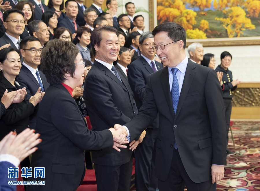 新华社北京10月24日电(记者 石龙洪)中共中央政治局常委、国务院副总理韩正24日在人民大会堂会见了澳门工联总会、街坊总会、妇联总会联合访京团,与他们交流并合影留念。