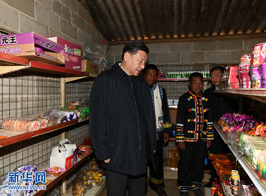 1月19日至21日,中共中央总书记、国家主席、中央军委主席习近平来到云南,看望慰问各族干部群众,向全国人民致以新春祝福。这是19日下午,习近平在腾冲市清水乡三家村中寨司莫拉佤族村小卖部了解年货供应情况。 新华社记者 谢环驰 摄
