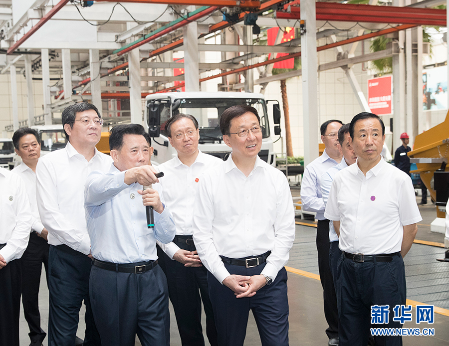 韩正前往中国铁建重工集团和三一集团,询问复工复产和援企稳岗政策落实情况,了解大型盾构机、工程机械等产品的研发生产。他强调,装备制造业是国之重器,要进一步强化自主创新,加强关键核心技术攻关,加大智能化装备研发力度,不断提高国产化水平,培育国际竞争新优势。在蓝思科技、华曙高科和新金宝光电,韩正详细了解企业推进高端制造业发展情况。他指出,要坚持创新驱动发展,大力发展数字经济、新材料等战略性新兴产业,企业家要敢想敢干、做精做细,实现先进制造业和现代服务业深度融合,促进我国制造业迈向全球价值链中高端。在广汽菲亚特克莱斯勒汽车有限公司和长沙戴卡科技有限公司,韩正分别考察了汽车整车和零部件生产。他表示,汽车产业要在合资合作基础上,培育壮大自主品牌,提升品牌知名度和影响力,大力发展新能源汽车。