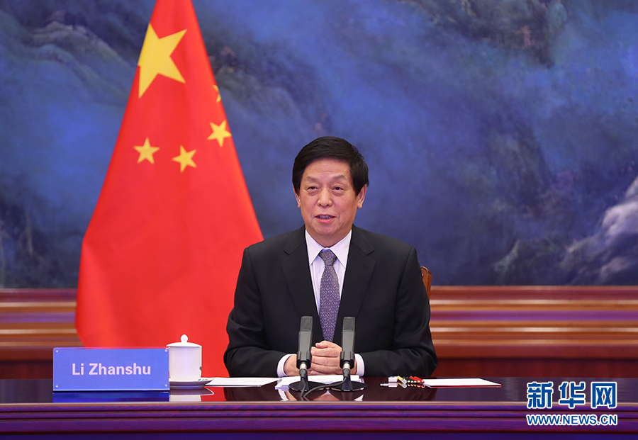 11月23日,全国人大常委会委员长栗战书在北京以视频方式同老挝国会主席巴妮举行会谈。新华社记者 姚大伟 摄