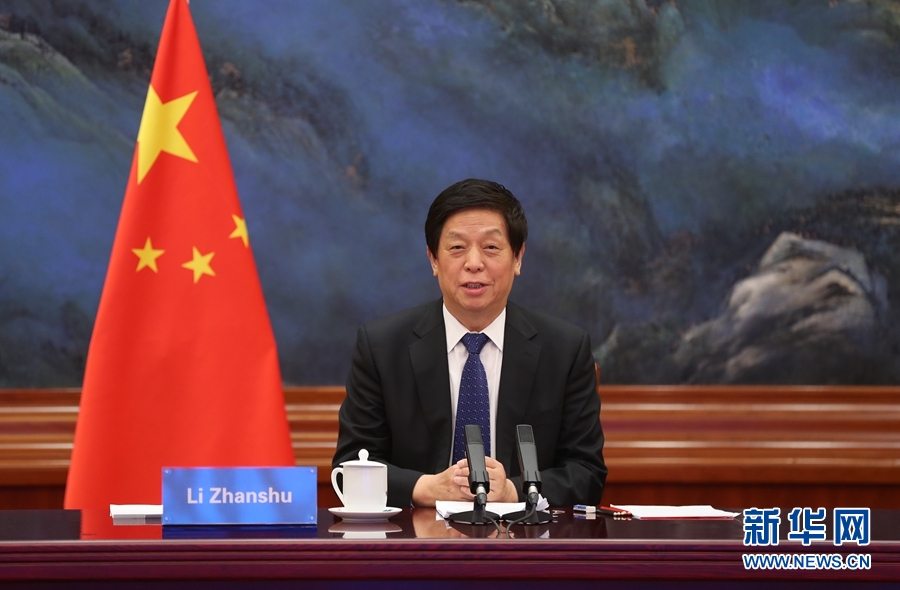 2月19日,全国人大常委会委员长栗战书在北京人民大会堂以视频方式同匈牙利国会主席克韦尔举行会谈。新华社记者 姚大伟 摄