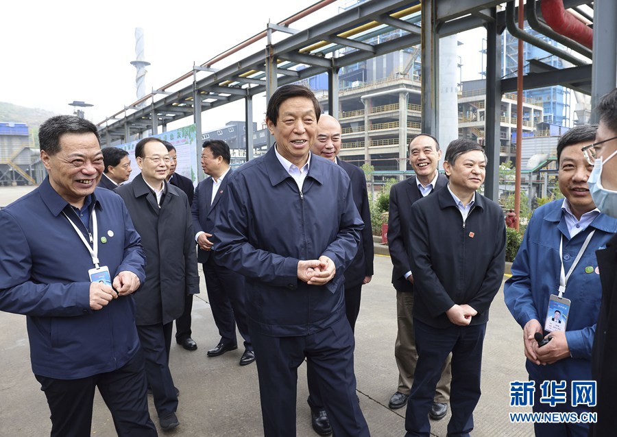4月9日至13日,中共中央政治局常委、全国人大常委会委员长栗战书率全国人大常委会执法检查组在陕西检查固体废物污染环境防治法实施情况。这是4月11日,栗战书在汉中锌业有限责任公司考察汉中锌业渣综合利用无害化处理项目。新华社记者 黄敬文 摄