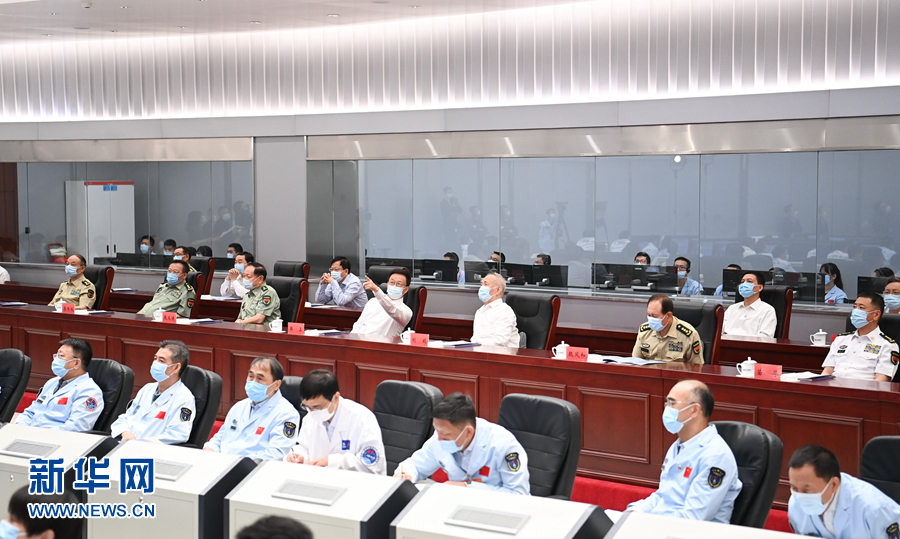 6月17日9时22分,神舟十二号载人飞船在酒泉卫星发射中心发射升空,准确进入预定轨道,顺利将3名航天员送上太空。中共中央政治局常委、国务院副总理韩正在北京航天飞行控制中心观看飞船发射实况,并向参研参试人员表示亲切慰问和祝贺。新华社记者 李响 摄