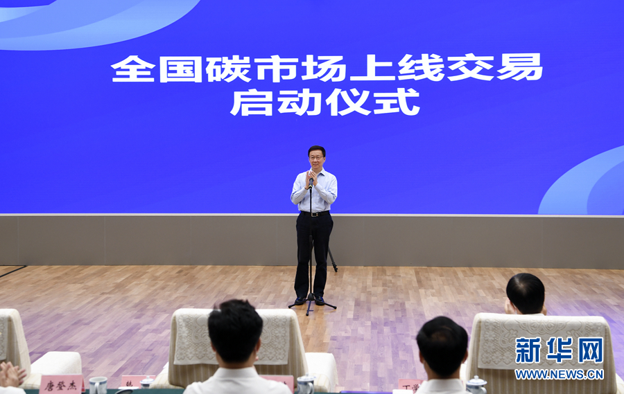 7月16日,全国碳排放权交易市场上线交易启动仪式以视频连线形式举行,在北京设主会场,在上海和湖北设分会场。中共中央政治局常委、国务院副总理韩正在北京主会场出席仪式,并宣布全国碳市场上线交易正式启动。新华社记者 张领 摄