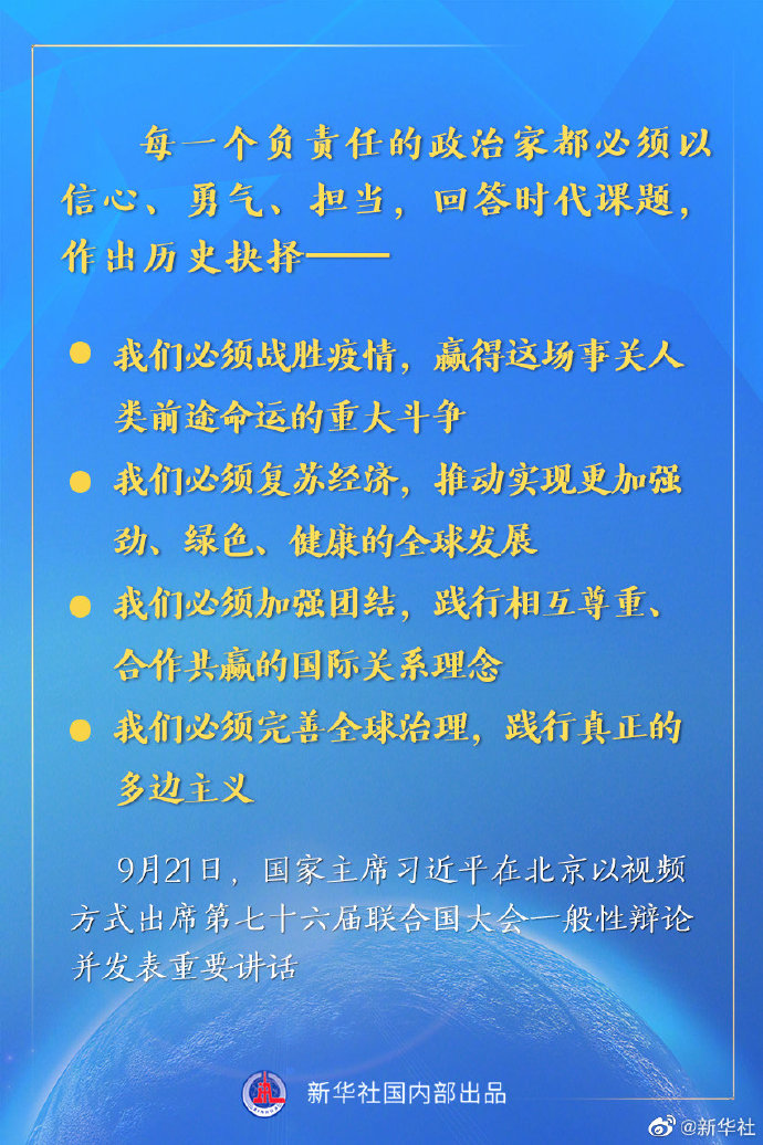 国家主席习近平21日在北京以视频方式出席第七十六届联合国大会一般性辩论并发表重要讲话。习近平强调,当前,疫情仍在全球肆虐,人类社会已被深刻改变。世界进入新的动荡变革期。每一个负责任的政治家都必须以信心、勇气、担当,回答时代课题,作出历史抉择。我们必须战胜疫情,赢得这场事关人类前途命运的重大斗争;我们必须复苏经济,推动实现更加强劲、绿色、健康的全球发展;我们必须加强团结,践行相互尊重、合作共赢的国际关系理念;我们必须完善全球治理,践行真正的多边主义。