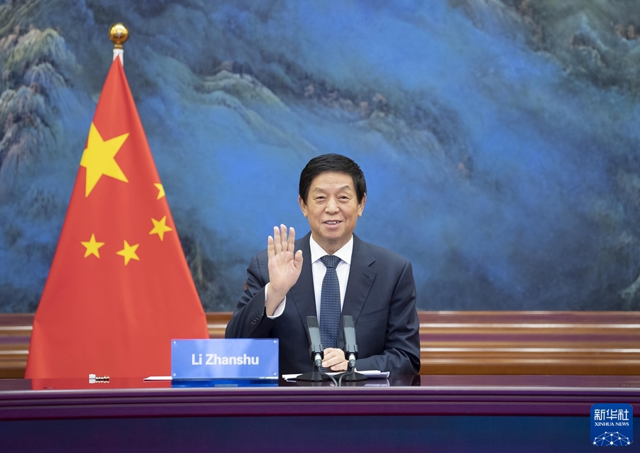 9月24日,全国人大常委会委员长栗战书在北京人民大会堂以视频方式同巴布亚新几内亚国民议会议长波马特举行会谈。 新华社记者 李涛 摄