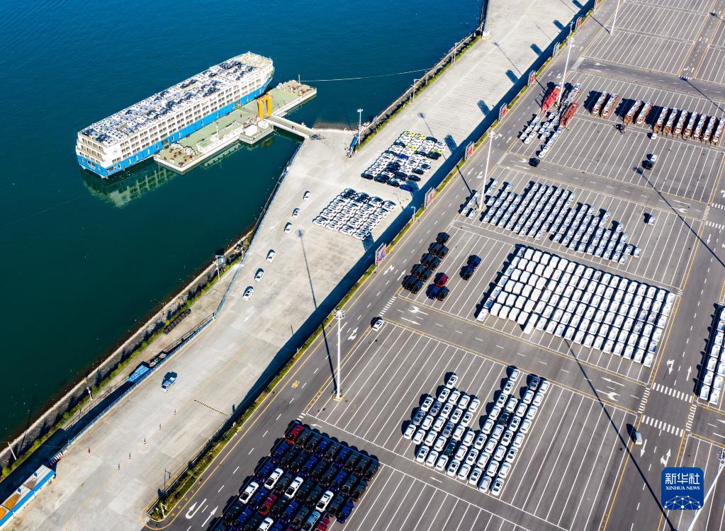 这是三峡库区湖北省宜昌市秭归县秭归港车辆分拨转运现场(2020年11月13日摄,无人机照片)。新华社发(郑家裕 摄)