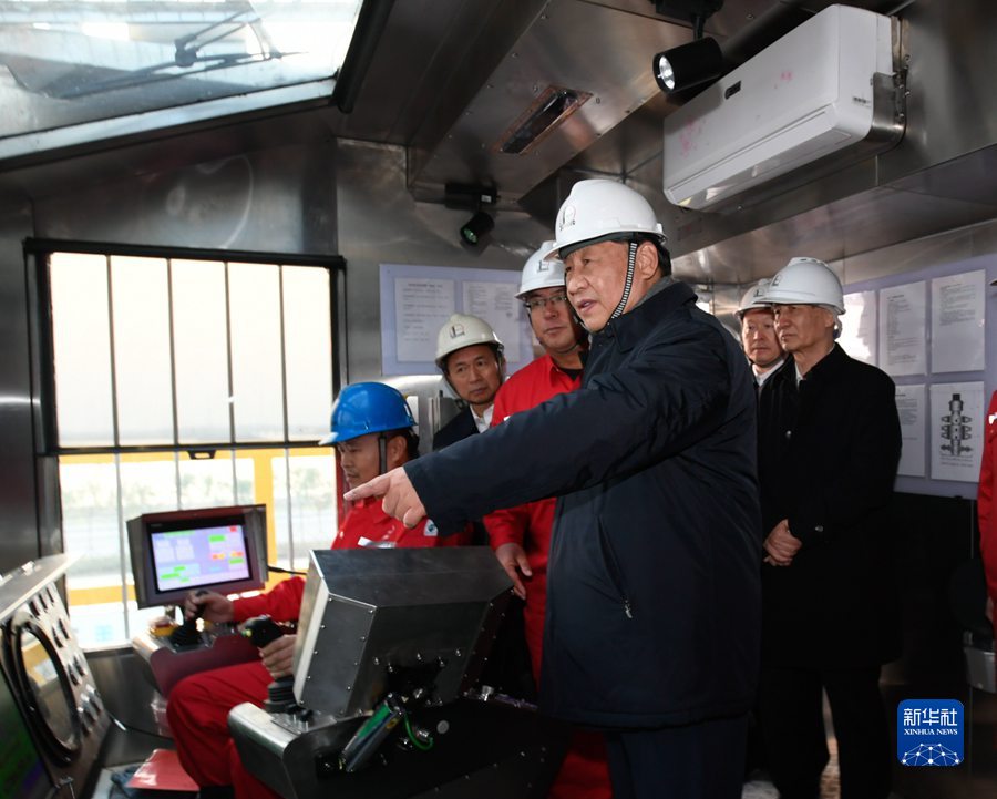 10月22日下午,中共中央总书记、国家主席、中央军委主席习近平在山东省济南市主持召开深入推动黄河流域生态保护和高质量发展座谈会并发表重要讲话。这是座谈会前,习近平21日下午在位于东营市莱州湾的胜利油田莱113区块考察时,登上二层钻井平台,察看钻井自动化设备。 新华社记者 李学仁 摄
