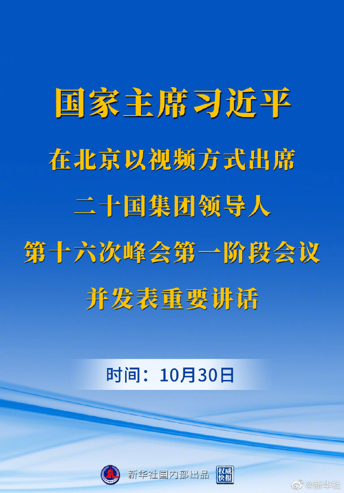 国家主席习近平10月30日在北京以视频方式出席二十国集团领导人第十六次峰会第一阶段会议并发表重要讲话。