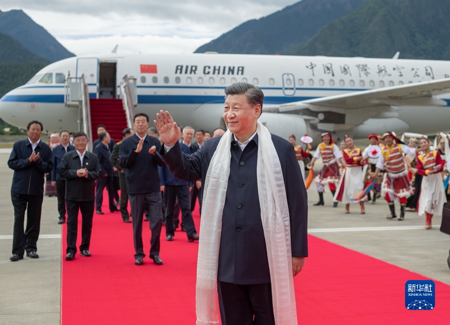 2021年7月21日至23日,习近平来到西藏,祝贺西藏和平解放70周年,看望慰问西藏各族干部群众。这是21日上午,习近平乘坐飞机抵达林芝米林机场,西藏各族干部群众载歌载舞,热烈欢迎习近平总书记的到来。