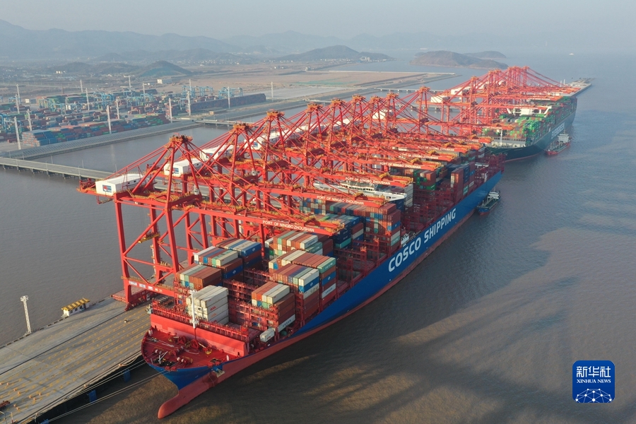 2021年2月19日,货轮停靠在浙江宁波舟山港梅东码头(无人机照片)。