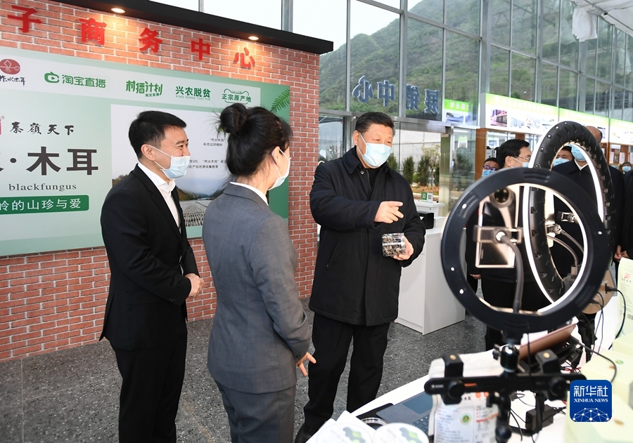 2020年4月20日至23日,习近平在陕西考察。这是4月20日,习近平在商洛市柞水县小岭镇金米村培训中心,了解该村发展木耳产业情况。